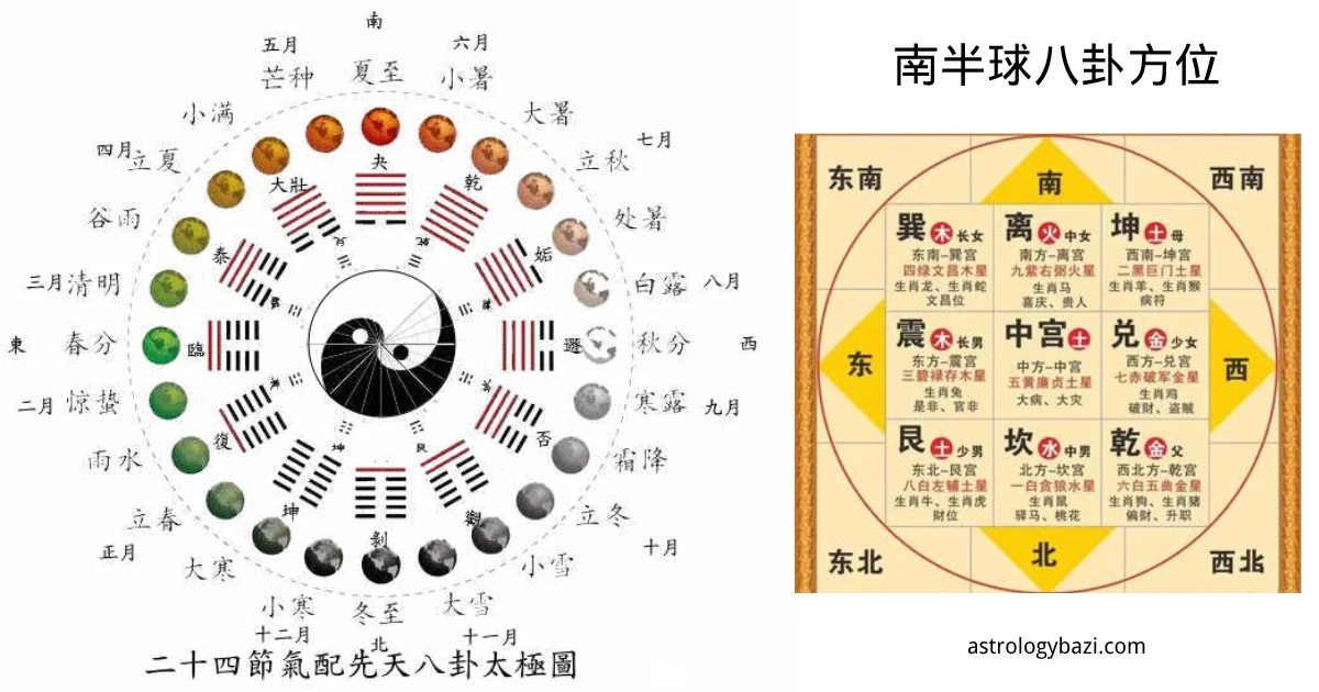 Southern Hemisphere Bagua Map Traditional 24 Solar Terms with Bagua (left) and Southern Hemisphere Bagua directional map (right) showing the adapted orientations for Australia.