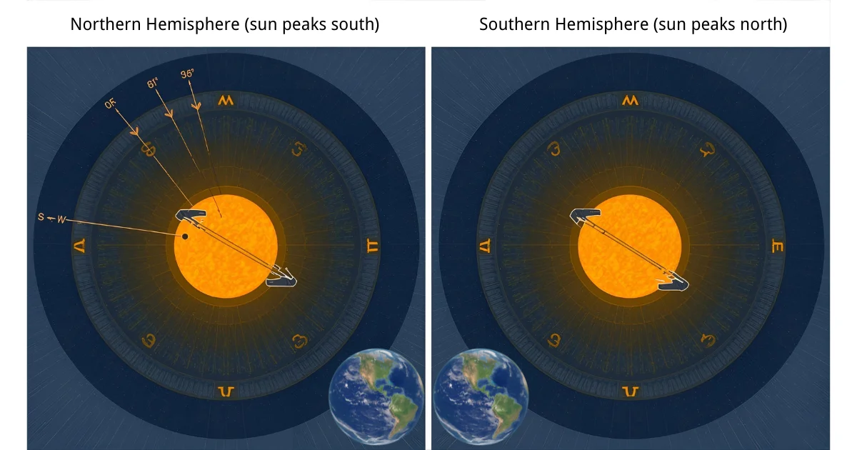 Sun Path Comparison: Northern vs Southern Hemisphere The sun peaks in the south (Northern Hemisphere) vs peaks in the north (Southern Hemisphere) - this fundamental difference changes everything about feng shui application.